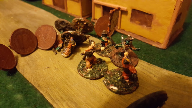 Scenery and plot. Clearing out a goblin village. the setting was the lowest, the lowlands, abandoned villages, fields and woods. A ribbon of derelict (need to make different ruins) houses, a smallholding and first use of my goblin huts. For this scale of game I need to add more detailed base.