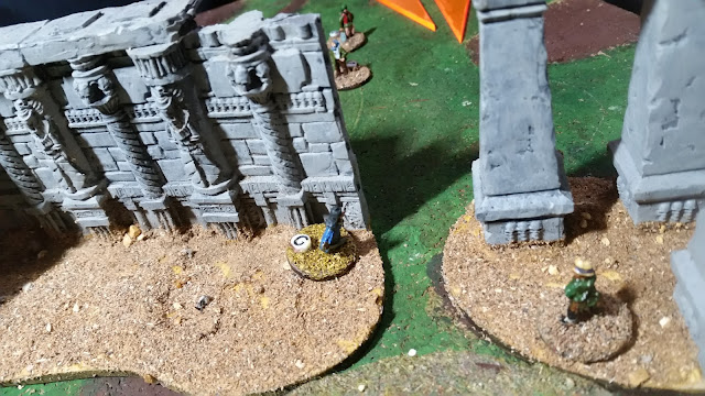 More exclamation, because there in the far distance is an ancient city! Surely here would be the answers! Further examination shows a huge stockade at the opposite side to the city. Phwar indicates that this is the seat of the cultists and that she would prefer to go THAT way, towards the city. With the weird, echoing cry of “Echi echi thum!” groups of cultists are making their enthusiastic, but not overly fast, way towards you!