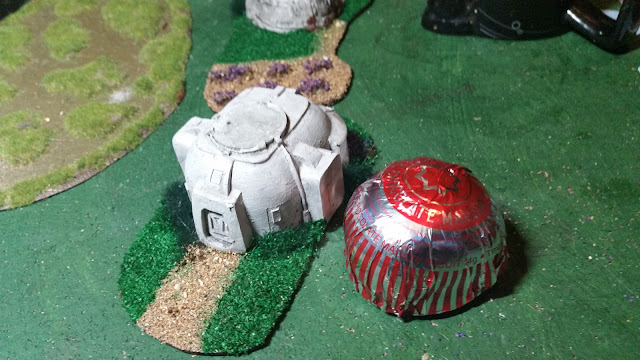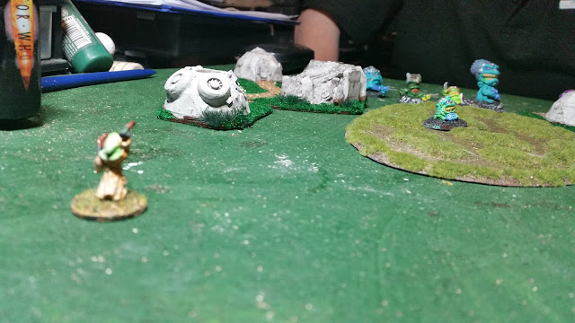 Pretention of the Gord started proceedings, rushing Drone 3 (3 dots, got it?) First activation he got there- second he prepares to pounce - but there's a reaction! The poor Drone got it - and did a runner. A nasty slash.