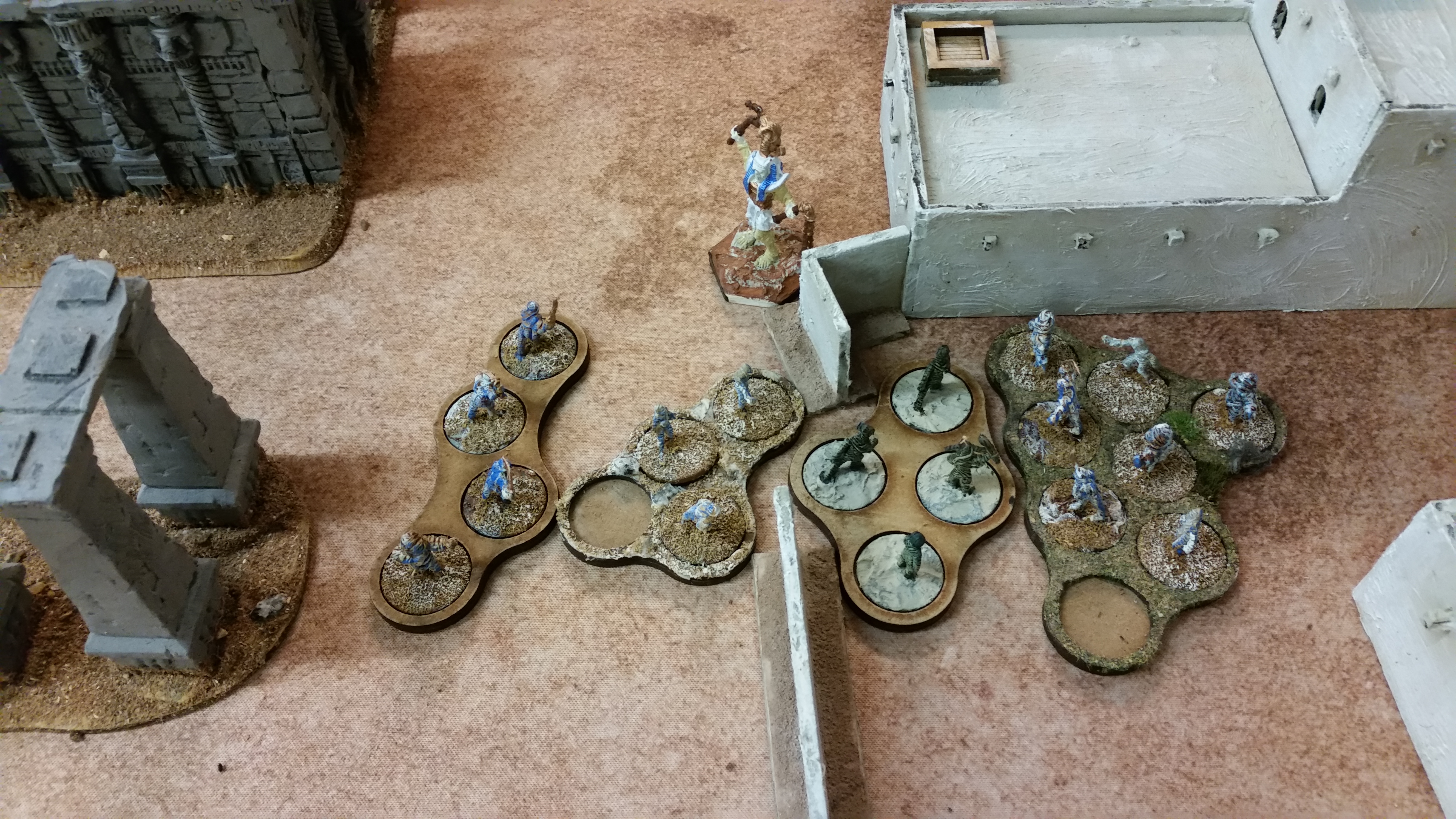 "Push me - pull you" sort of day. Our Tony had car problems, and living out in the back of beyond means that finding a mechanic is one thing - finding one who has got the right part--. So instead of a week I had 2 days. The good news, I got a lift, so I could get shedloads more out to Entoyment. I adjusted- up the game we did on 14 September and Osirus from earlier. First time I've mixed all, well most, of my Egyptian terrain.