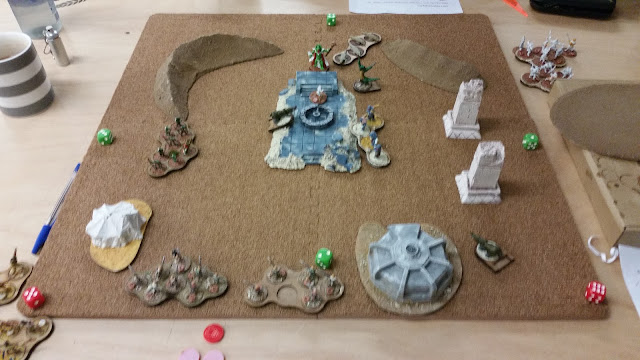 Game 3 Temple. Tony turns up so it's a mere non-swapsies. I didn't take a set-up picture as it was similar to last time and me phone was charging. One thing I'd learnt last time - attacking good, getting away from edges better. Tony went for a legend rather than mortal unit.