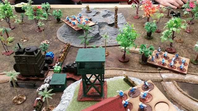 Border barrier, post, guard tower and barrack tents with a command hut.The sneaky Western Arnyarans start- 6 pre-planned artillery strikes! I got 4, one knocked a life out of the commander. Then they snuck in. You don'r roll for activation, they make a move plus 1D6 extra inches. I ended up with one unit at the base of the bluff, the cycle unit just below in the middle of the field.
